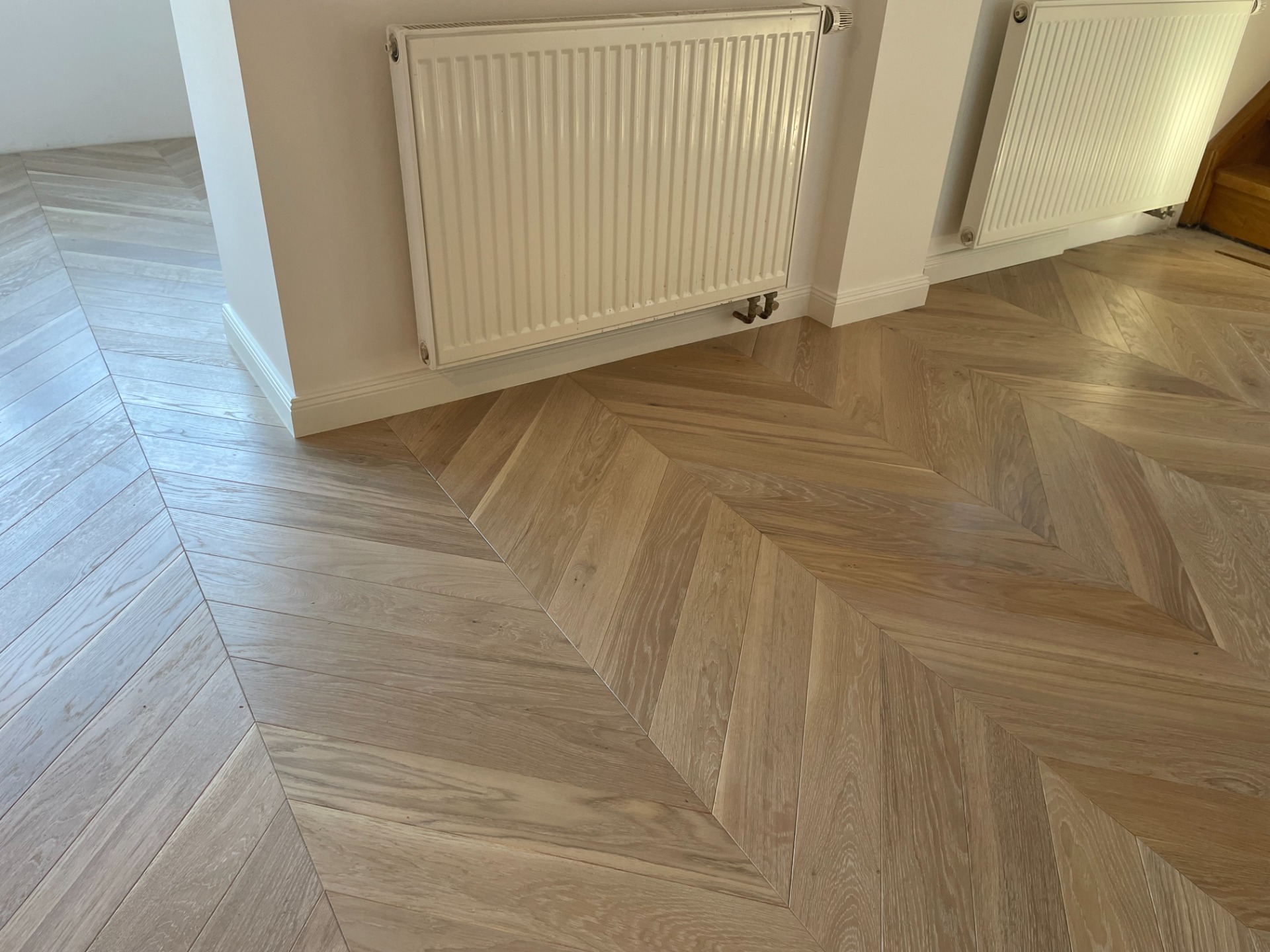 Dubové duoparkety, jsou ideální na podlahové topení, povrchová úprava olej Manhattan zachová barvu surového dubového dřeva. Pokládka bez prahů je velice efektní a praktická:) Třídění natur - bez barevných odlišností. Léto 2021, Praha Vinohrady