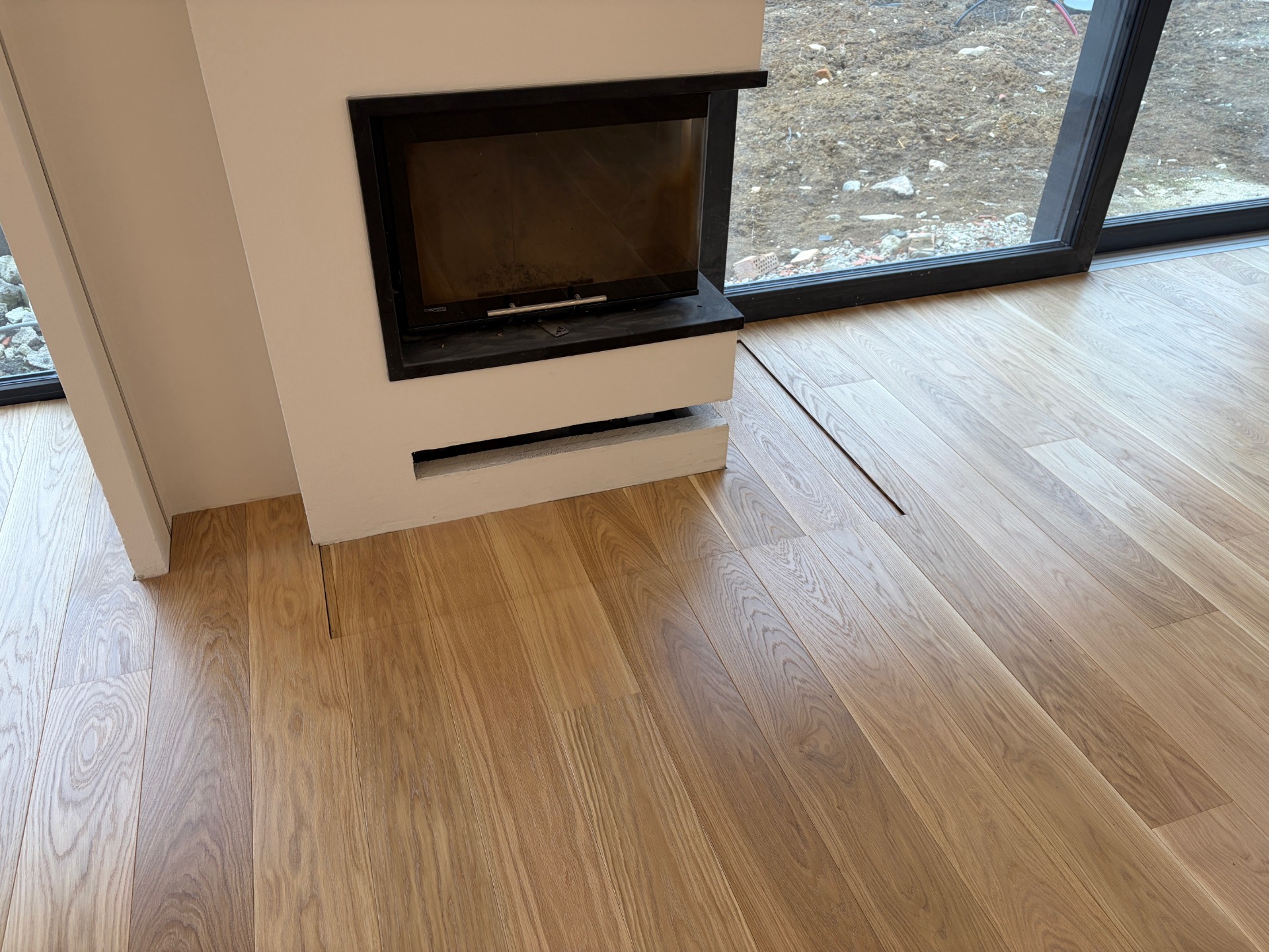 Ideální řešení pro vložené sklo, je příprava v podkladu - 6 anebo 8mm snížený podklad. Realizace dub 1/6 bergen - přirozená patina.