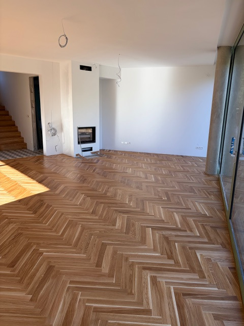 Dubové duoparkety, jsou ideální na podlahové topení, povrchová úprava olej Manhattan zachová barvu surového dubového dřeva. Pokládka bez prahů je velice efektní a praktická:) Třídění natur - bez barevných odlišností. Léto 2021, Praha Vinohrady