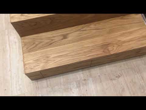 Dubová podlaha, vhodná na podlahové topení, dubové vrstvené prkna s úpravou olej Manhattan - olej, který zachová vzhled surového dubového dřeva. Poslední schod plynule přechází do podlahy v 1.patre, přechod je bez lišty.