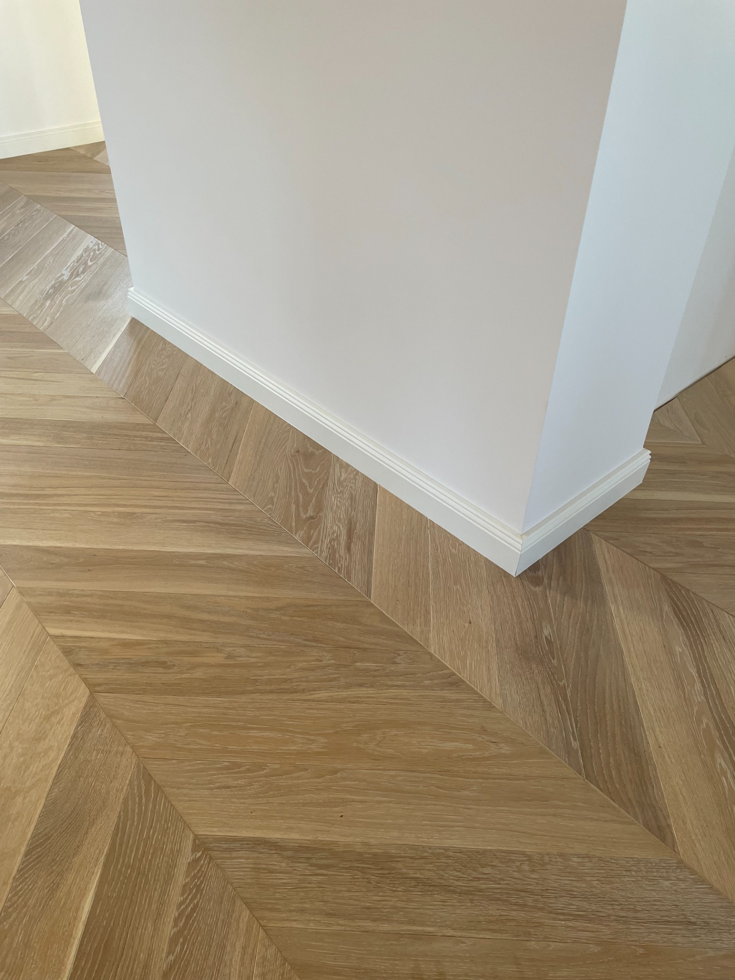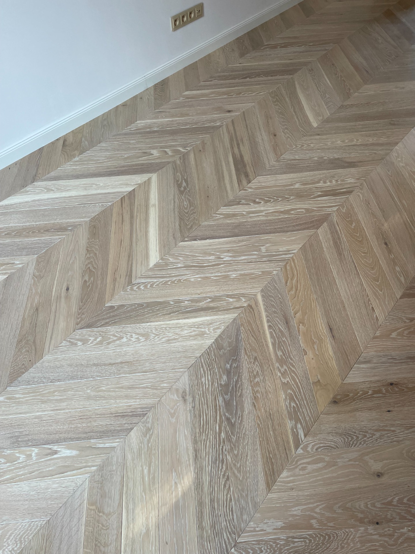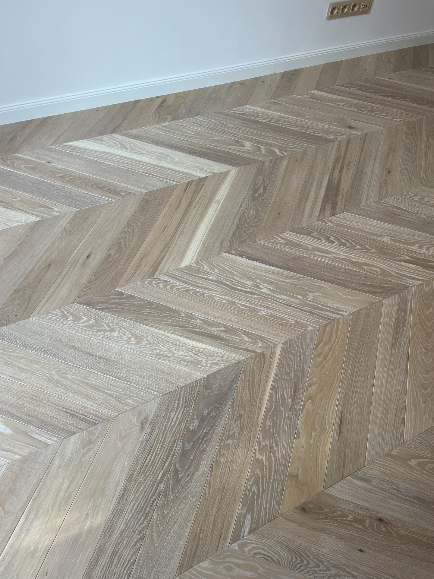 Chevron - francouzský stromeček, je exkluzivní provedení dřevěné podlahy. Povrchová úprava olej White Plains