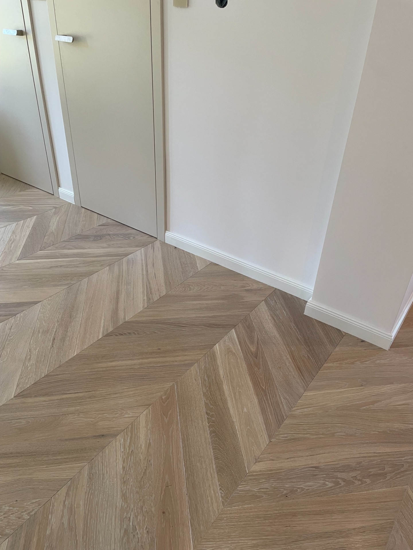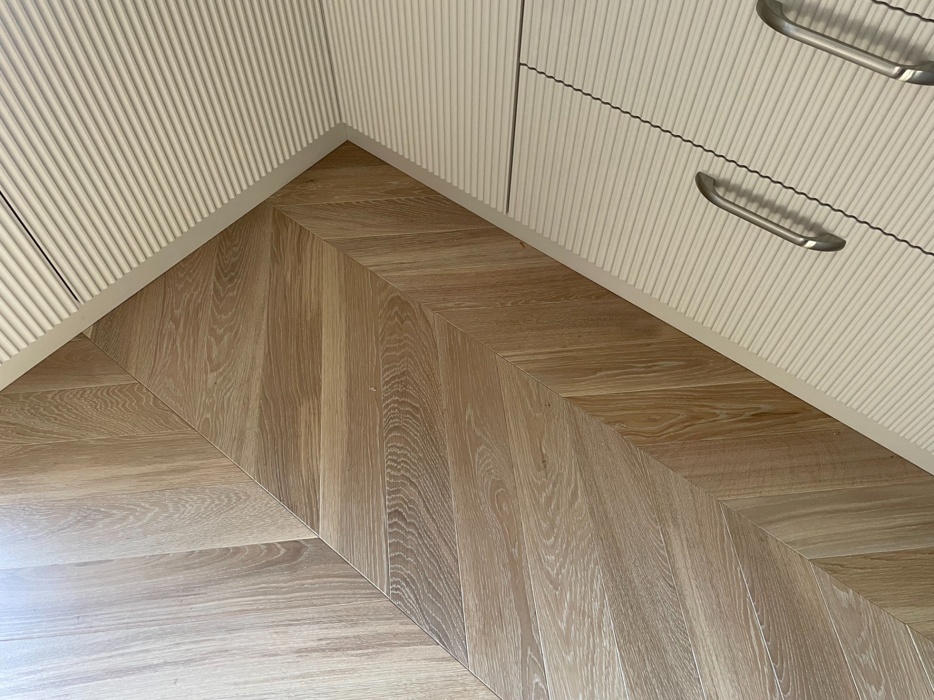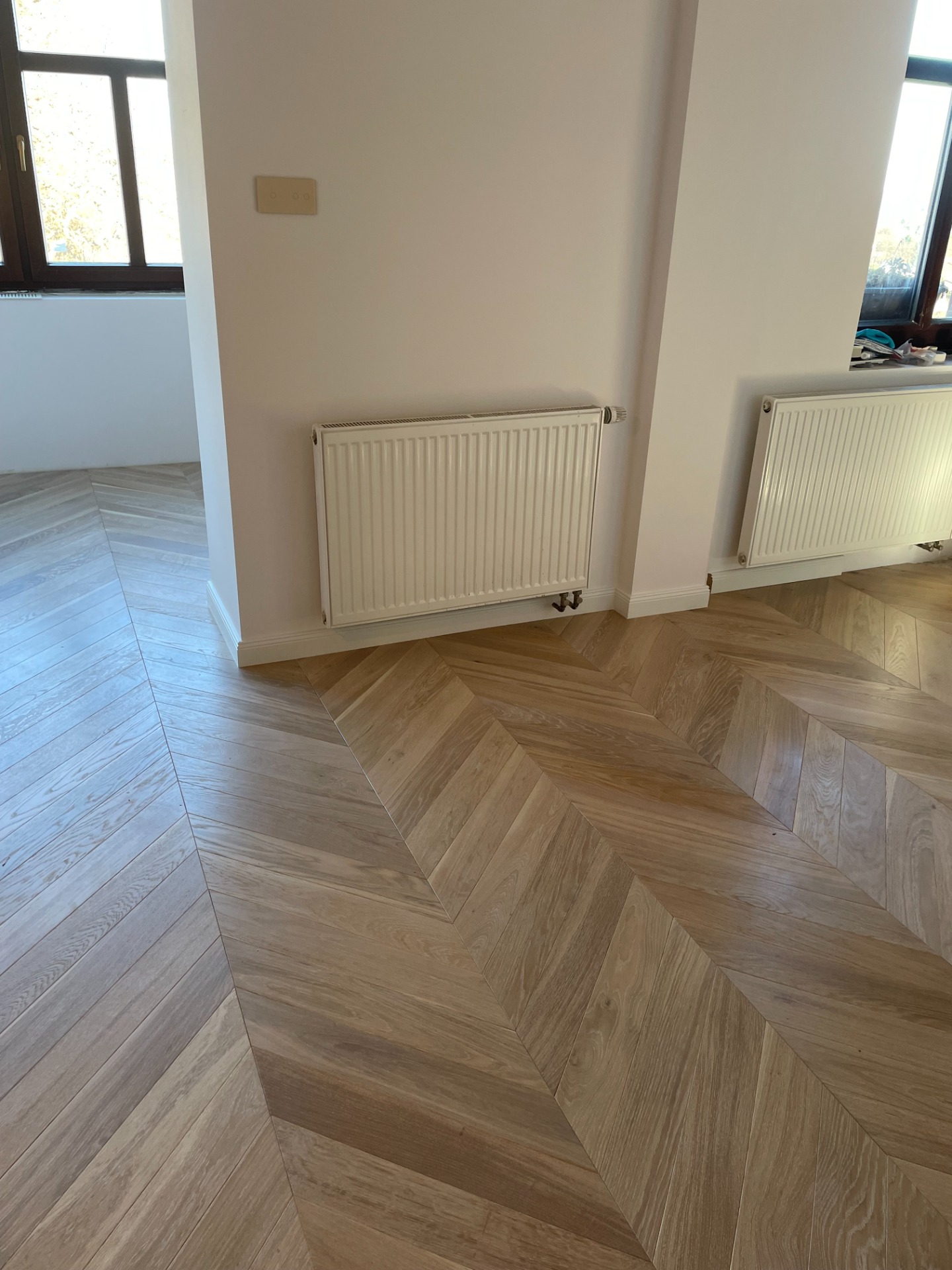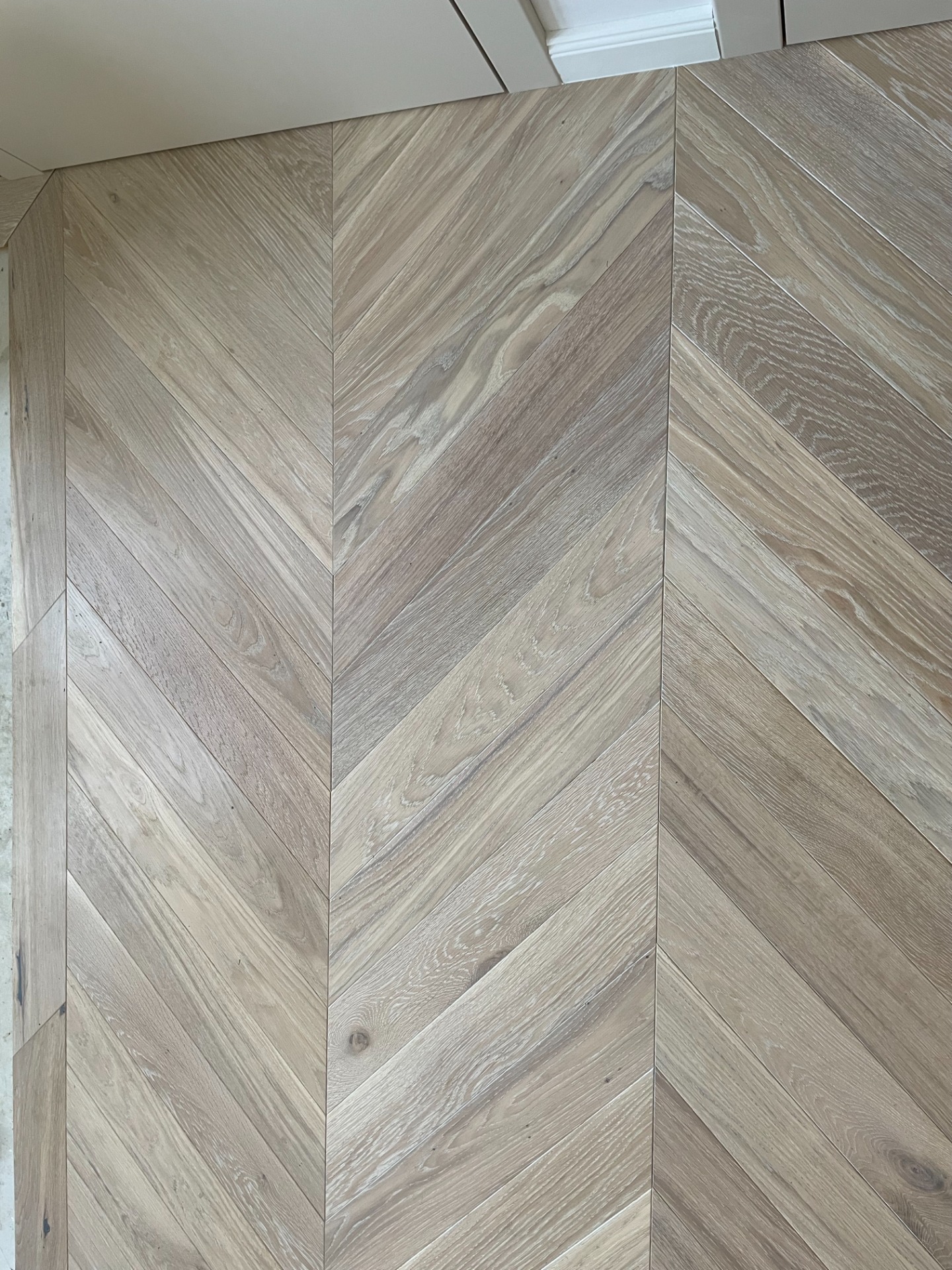 Chevron - francouzský stromeček, je exkluzivní provedení dřevěné podlahy. Povrchová úprava olej White Plains